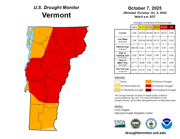 From mid June until late October Vermont slowly fell further into drought, with mid-October marking the peak of the arid conditions. On October 7th the US Drought Monitor listed the entirety of the state in drought, with 1/3rd in severe drought and nearly 2/3rds enduring extreme drought conditions.